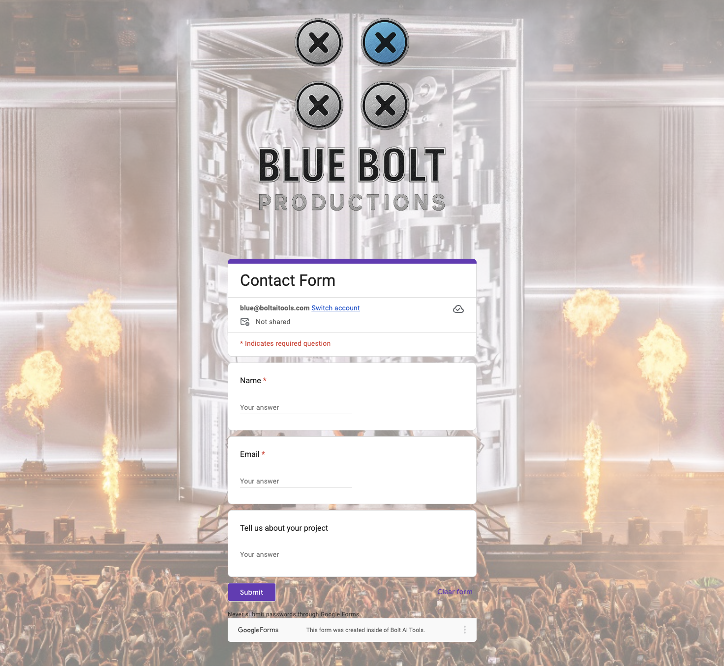 The result is a lightweight, affordable digital foundation that allows Blue Bolt Productions to direct clients to a professional website, collect inquiries effortlessly, and maintain brand credibility — all without managing a complex tech stack. It’s a simple system built to do exactly what it needs to do, nothing more and nothing less.